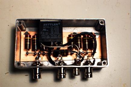 The circuit is not particularly remarkable: the transceiver RF jack goes to a relay T/R switch. The TX side of the relay goes through a hefty 20-dB attenuator to a BNC jack. The attenuator is rated at 5 watts continuous duty and considerably more at lower duty cycles, perfect for this application. The RX side goes straight through to a second BNC jack. The TX circuit is normally closed (and RX normally open). This minimizes the chance of accidentally dumping 5 watts into the RX side of the transverter.